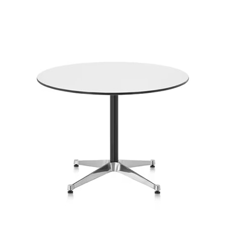 イームズ夫妻の自邸でも愛用されていた、円形天板のコントラクトベーステーブル。無駄を削ぎ落とした構造と、安定感のあるベースが生む端正な佇まいが魅力で、住空間からワークシーンまで幅広く調和します。