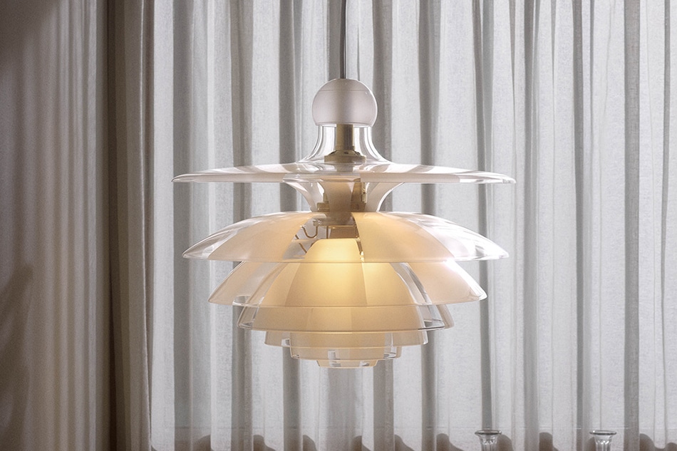 1928年にプロトタイプが披露された「PH セプティマ」が待望の復刻。7枚のシェードで構成されており、透明な面とフロスト加工された面を交互に配置。下方に向け柔らかく心地良いグレアフリーの光が広がります。(1,239,700円)