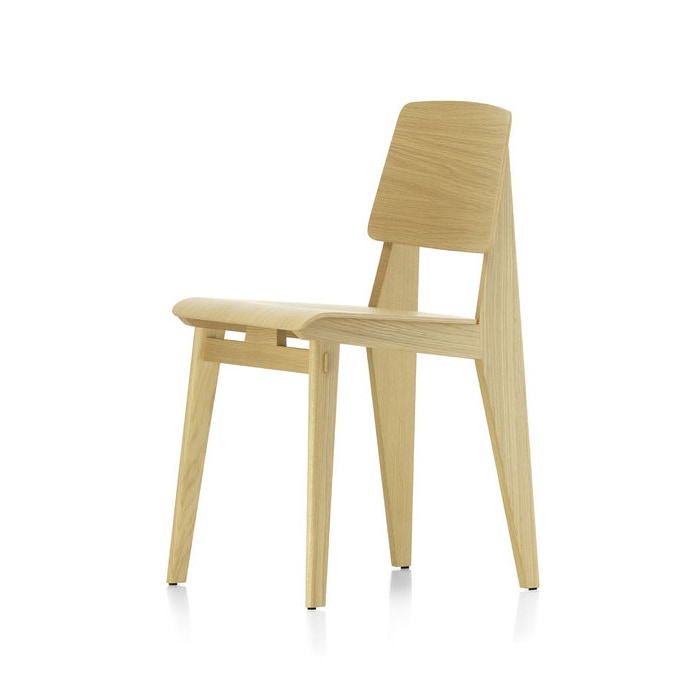 「シェーズ・トゥ・ボワ」は、1941年にプルーヴェによって制作されたビス不使用の木製モデルを参照し復刻されています。当時、顧客の要望に合わせダークカラーのステイン仕上げも生産されていたことから、ナチュラルオークとダークオークの2種で展開。(96,800円)