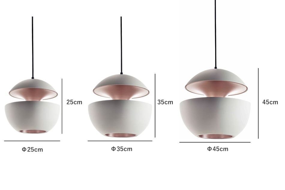 サイズは「Φ250」と「Φ350」「Φ450」の3種類。カラーは4種類ございます。サイズ違いで設置して空間にリズム感を与えたり、異なるカラーを組み合わせてアクセントを楽しむこともできます。自宅はもちろん、ホテルやカフェなど様々なシーンで活躍する照明です。