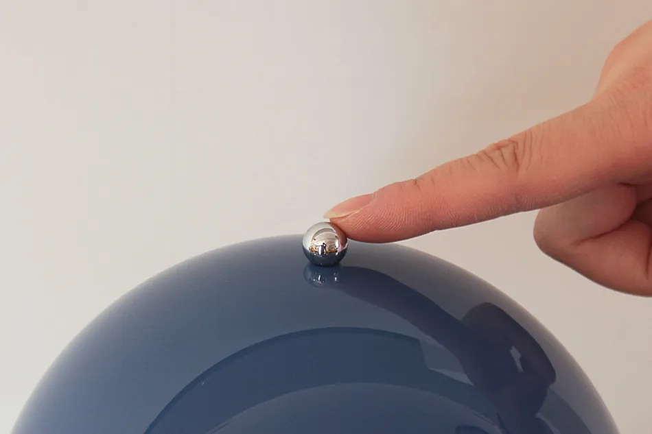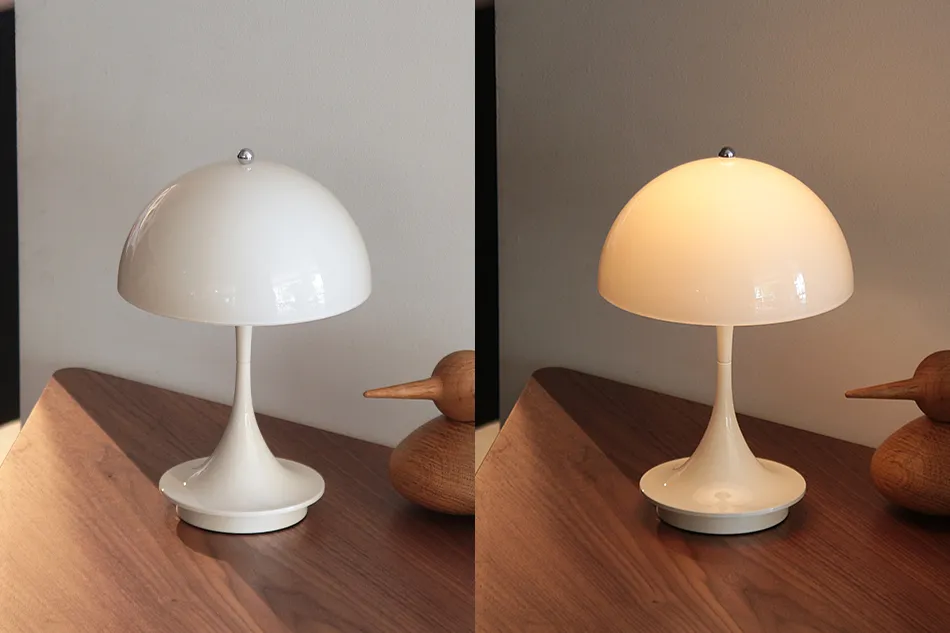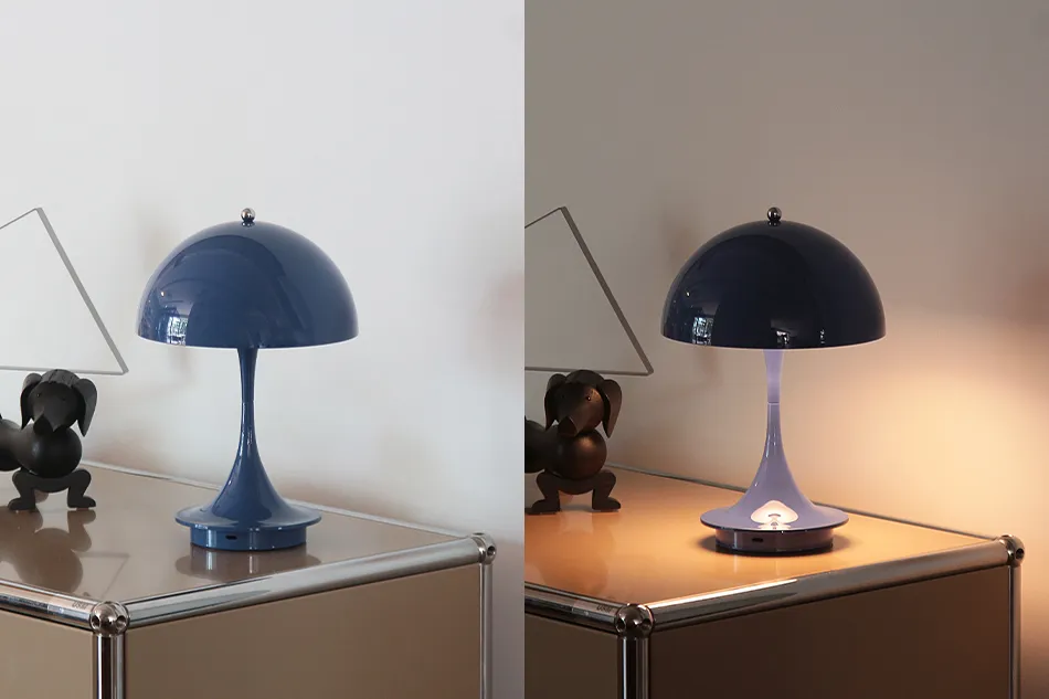 Verner Panton(ヴェルナー・パントン)の名作照明「Panthella(パンテラ)」を充電式のコードレス仕様にした「Panthella Portable(パンテラ ポータブル)」の程よいサイズ感の「250」。2025年にカラーラインナップが追加され、カラーは光を通す「オパール」シェードが6種類、光を通さず下方へ光を届ける「オペーク」シェードが7種類の全13種類から選べるようになりました。また、トップのナットをタッチすることで点灯できるようになりました。ベースのボタンが無くなり、より洗練されたデザインになっています。