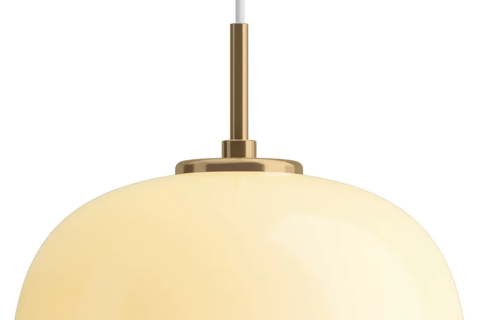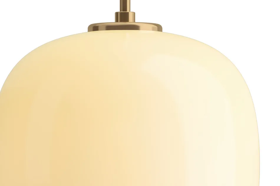 丸みを帯びたガラス製シェードは少し艶があり、無塗装の真鍮との相性が抜群です。ハンドメイドの吹きガラスは、4層構造となっており、最内層と最外層は透明に磨かれたガラスに中間層のペールイエローと乳白色ガラスが挟み込まれています。この丁寧な作業によって、控えめでありながらも上品な美しい照明となりました。