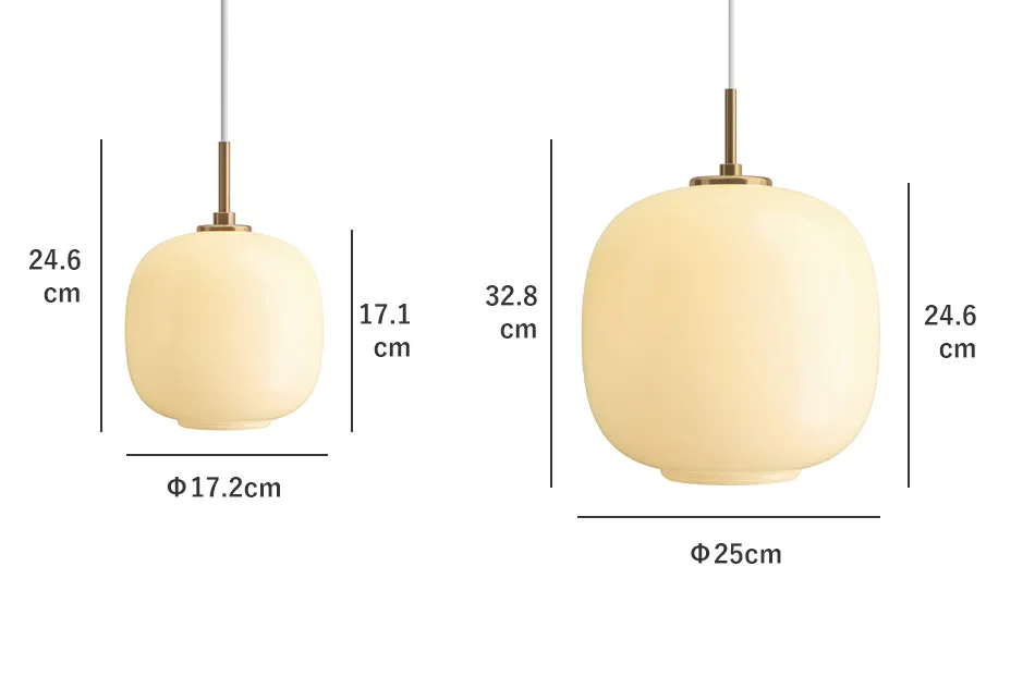 φ17cmは、キッチンやカウンターに多灯吊り、φ25cmは長方形のテーブル(180cm程度)に2灯吊りがおすすめです。 また、階段などの吹き抜け空間に大小サイズ違いで吊るすと、立体的な表情を楽しんでいただけます。