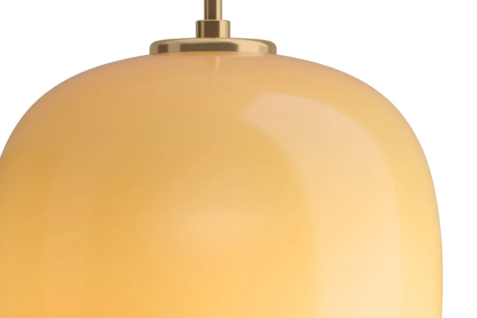 丸みを帯びたガラス製シェードは少し艶があり、無塗装の真鍮との相性が抜群です。ハンドメイドの吹きガラスは、4層構造となっており、最内層と最外層は透明に磨かれたガラスに中間層のアンバーと乳白色ガラスが挟み込まれています。この丁寧な作業によって、控えめでありながらも上品な美しい照明となりました。
