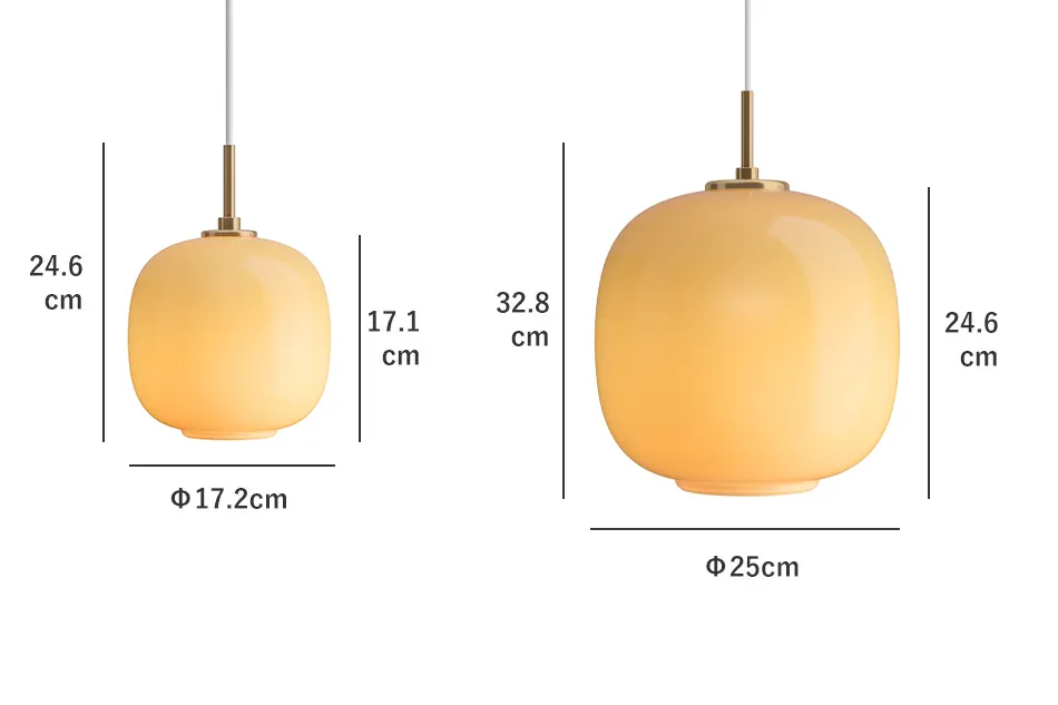 φ17cmは、キッチンやカウンターに多灯吊り、φ25cmは長方形のテーブル(180cm程度)に2灯吊りがおすすめです。 また、階段などの吹き抜け空間に大小サイズ違いで吊るすと、立体的な表情を楽しんでいただけます。
