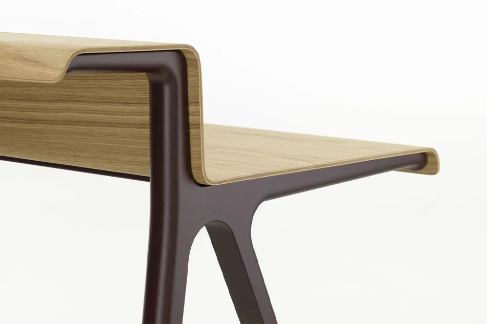 「クーリエ」は、木の天板とアルミニウムのフレームという異素材を組み合わせたデスク。名前は、側面から見たときのシルエットが欧文フォントのセリフ体を想起させるため、ヨーロッパで馴染み深いセリフ体のひとつである“クーリエ”にちなんで名づけられました。