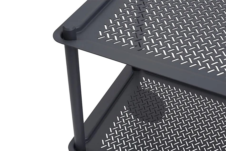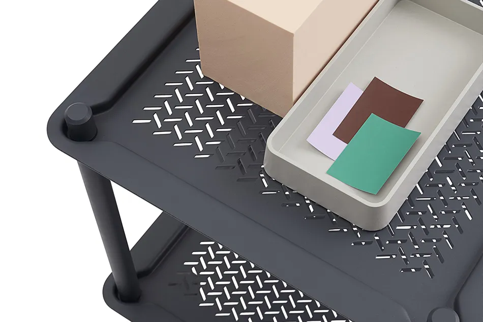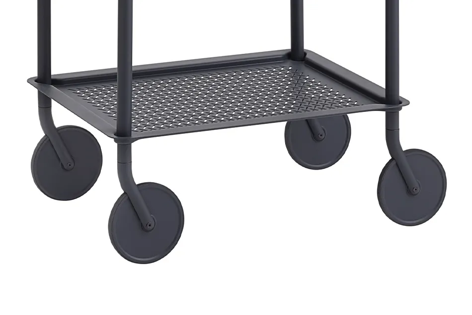 パリを拠点に活動するデザインスタジオ、Normal Studio(ノーマルスタジオ)が手掛けた「Flow Trolley(フロウ トロリー)」。自宅やオフィス、ホテルなどあらゆるシーンで使えることを考えてデザインされたキャスター付きのワゴンです。スチールの天板とフレーム、そしてキャスターのシンプル構成ですが、斜めに配置された平たく大きめのキャスターやトレイに施されたパンチング加工など、どこかユニークで印象に残るデザインです。