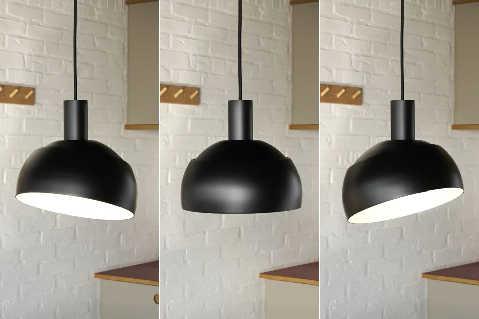 こちらの照明の特徴は、可動式のシェードにより光の角度を自由に変えられること。上部のシェードが下部のシェード上で開店する仕組みになっており、理想的な光の当て方ができます。サイズは25cmとコンパクトなため、リビングやベッドルームの間接照明にしたり、2灯吊りでダイニングシーンにも。シェードを稼働させてスポットライトのような使い方もできます。